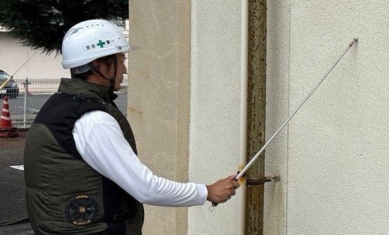このような劣化を調査する最もシンプルな方法が打診調査です。打診棒で外壁をたたきながら音の違いを聞き分け、劣化状況を調べます。